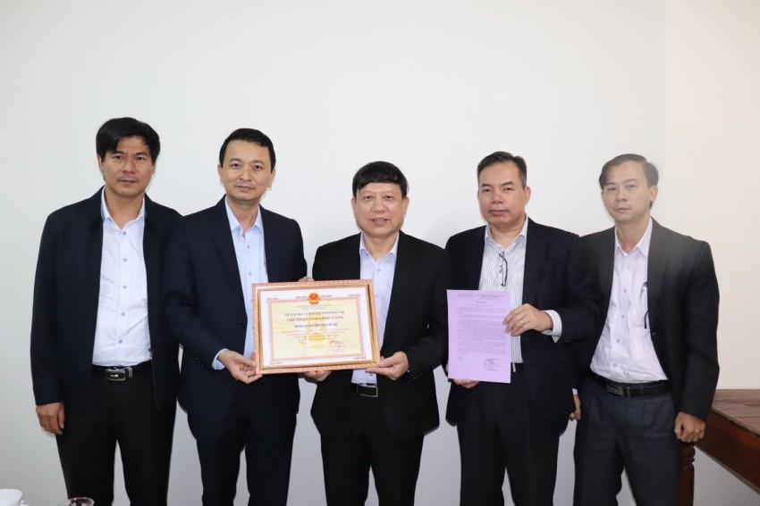 Đ/c Vũ Minh Đức, Chủ tịch Công đoàn Giáo dục Việt Nam và TS. Bùi Đức Hùng, Phó BT thường trực Đảng ủy, Chủ tịch Công đoàn Trường ĐHBK Hà Nội trao tặng biểu trưng cho Trường Tiểu học và THCS Hướng Việt, huyện Hướng Hóa, tỉnh Quảng Trị.