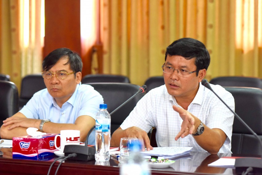 Báo cáo Đoàn công tác, PGS Hoàng Minh Sơn đã trình bày việc thực hiện 9 nhiệm vụ và giải pháp được nêu trong Nghị quyết 29 – NQ/TW trong 5 năm tại Trường ĐHBK Hà Nội.