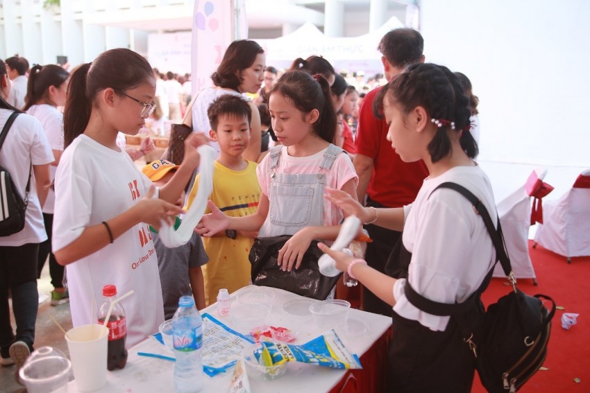 Tại gian hàng Học làm bánh, các em nhỏ cùng bố mẹ được tham gia trải nghiệm các lớp học làm bánh đầy hấp dẫn với chiếc bánh xinh xắn có logo Bách khoa