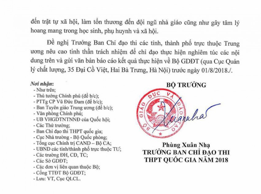 Đề nghị Trưởng ban Chỉ đạo thi các tỉnh, thành phố trực thuộc Trung ương nêu cao tinh thần trách nhiệm để chỉ đạo thực hiện nghiêm túc các nội dung trên và gửi văn bản báo cáo kết quả thực hiện về Bộ GD&ĐT trước ngày 1/8/2018.