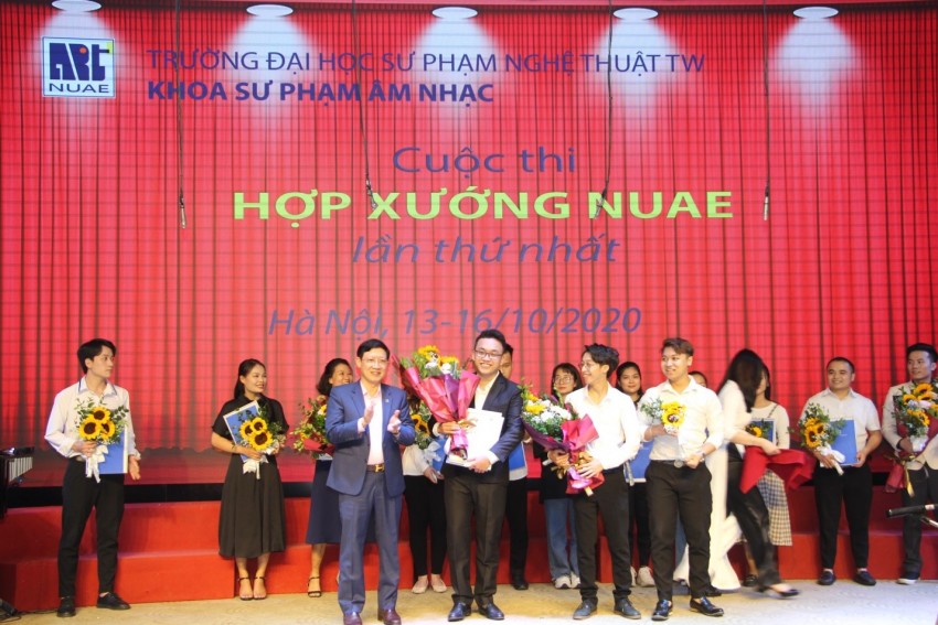Lãnh đạo khoa Sư phạm Âm nhạc trao Giấy chứng nhận và tặng hoa chúc mừng 12 đội tham gia Cuộc thi
