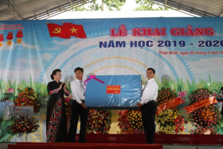 Trong không khí náo nức, thầy trò Trường THPT Tháp Mười, huyện Tháp Mười (Đồng Tháp) rất vui mừng chào đón Chủ tịch Quốc hội Nguyễn Thị Kim Ngân dẫn đầu đoàn công tác của Quốc hội đến chúc mừng và chung vui trong lễ khai giảng.