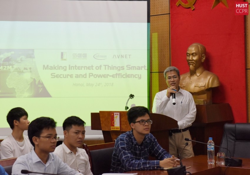 Chủ điểm chính này đã được các chuyên gia hàng đầu trong lĩnh vực IoT của hãng công nghệ lớn trên thế giới (Infineon, AVNET) trao đổi với 60 sinh viên của Viện Điện, Trường ĐHBK Hà Nội trong Hội thảo khoa học quốc tế với chủ đề “Making Internet of Things smart, secure and power efficiency” vào ngày 24/05/2018.