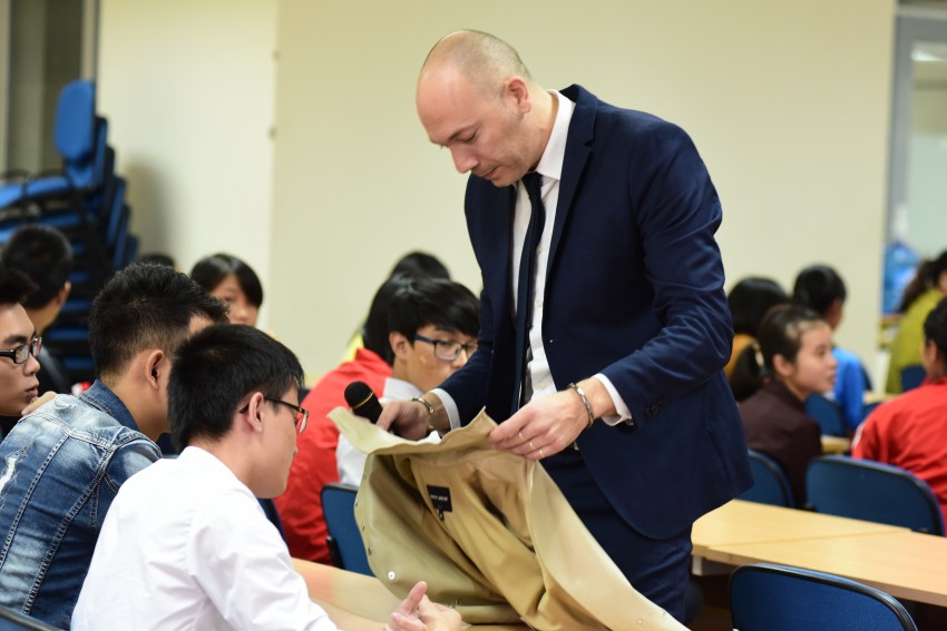 Ông Niccolò Sbaraglia cũng dành thời gian trao đổi và hướng dẫn sinh viên cách lựa chọn chất liệu và truyền cảm hứng và niềm tin để trở thành những chuyên gia thực thụ trong ngành Dệt may – Da giầy và Thời trang. Ông đưa ra 2 lời khuyên: thứ nhất, sinh viên hãy dành thời gian đến xưởng sản xuất trong lĩnh vực dệt may để tìm hiểu học hỏi thật nhiều chứ không nên quá chú ý vào việc đi xem biểu diễn thời trang, thứ hai, bạn cần phải học tập thì mới có thể sáng tạo và làm ra những sản phẩm có chất lượng cao.