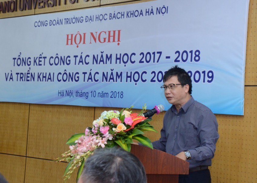 Thay mặt Ban Thường vụ Công đoàn Trường, TS Bùi Đức Hùng đã tổng kết công tác Công đoàn năm học 2017 - 2018 và phương hướng, nhiệm vụ trọng tâm công tác năm học 2018-2019. Chủ tịch Công đoàn Trường cho biết: Năm học 2017 – 2018, Công đoàn đã chăm lo đời sống, đại diện bảo vệ quyền, lợi ích hợp pháp, chính đáng cho 1826 cán bộ viên chức, nhà giáo và người lao động (CBVC, NG&NLĐ) .Việc quan tâm đến đời sống vật chất và tinh thần cho các công đoàn viên của Trường luôn là một trong những hoạt động được Công đoàn Trường coi trọng, phát triển. Đặc biệt, từ tháng 9/2018, Trường ĐHBK Hà Nội áp dụng quy chế chi tiêu nội bộ mới, Công đoàn Trường đã lắng nghe nhiều ý kiến đóng góp của các công đoàn viên và kịp thời báo cáo với Trường, từ đó có những điều chỉnh phù hợp.