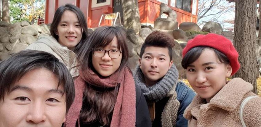Bảo Thư và Hồng Ngọc (thứ 2 và 3 từ trái qua) với các bạn sinh viên Nhật Bản