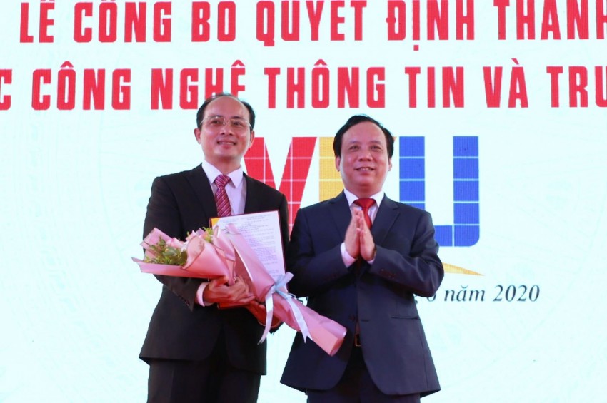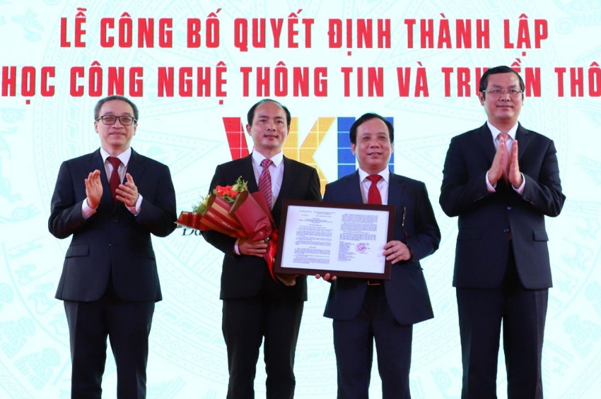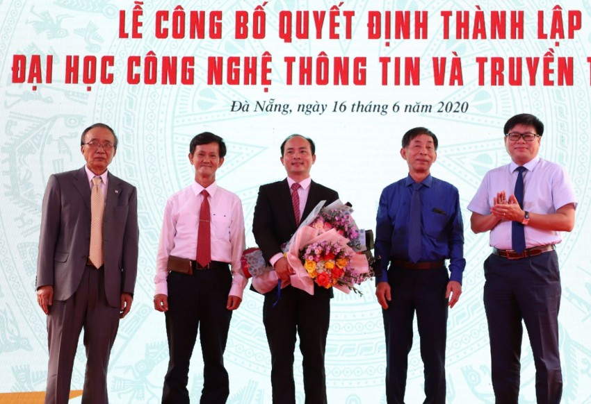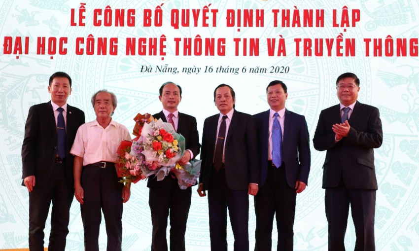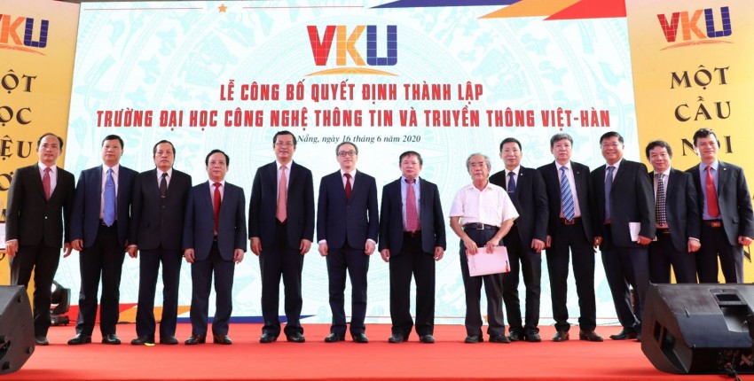 Tại buổi Lễ, TS. Phạm Xuân Hậu-Phó Vụ trưởng Vụ TCCB Bộ GD&ĐT đã công bố và Thứ trưởng Bộ GD&ĐT Nguyễn Văn Phúc đã trân trọng trao cho PGS.TS. Nguyễn Ngọc Vũ-Bí thư Đảng ủy, Giám đốc ĐHĐN và PGS.TS. Huỳnh Công Pháp-Quyền Hiệu trưởng Quyết định số 15/QĐ-TTg của Thủ tướng Chính Phủ (ngày 03/01/2020), theo đó chính thức thành lập Trường ĐH CNTT và Truyền thông Việt-Hàn, ĐHĐN (viết tắt là VKU) trên cơ sở hợp nhất các cơ sở đào tạo (Trường Cao đẳng CNTT hữu nghị Việt-Hàn (trực thuộc Bộ TT&TT); Trường Cao đẳng CNTT, Khoa CNTT và Truyền thông và một số đơn vị khác thuộc ĐHĐN) trở thành trường ĐH thành viên thứ sáu của ĐHĐN, chịu sự quản lý trực tiếp của ĐHĐN. Đại diện Ban TCCB ĐHĐN cũng đã công bố và Bí thư Đảng ủy, Giám đốc ĐHĐN Nguyễn Ngọc Vũ đã trao Quyết định giao quyền Hiệu trưởng VKU cho PGS.TS. Huỳnh Công Pháp và tặng hoa chúc mừng.