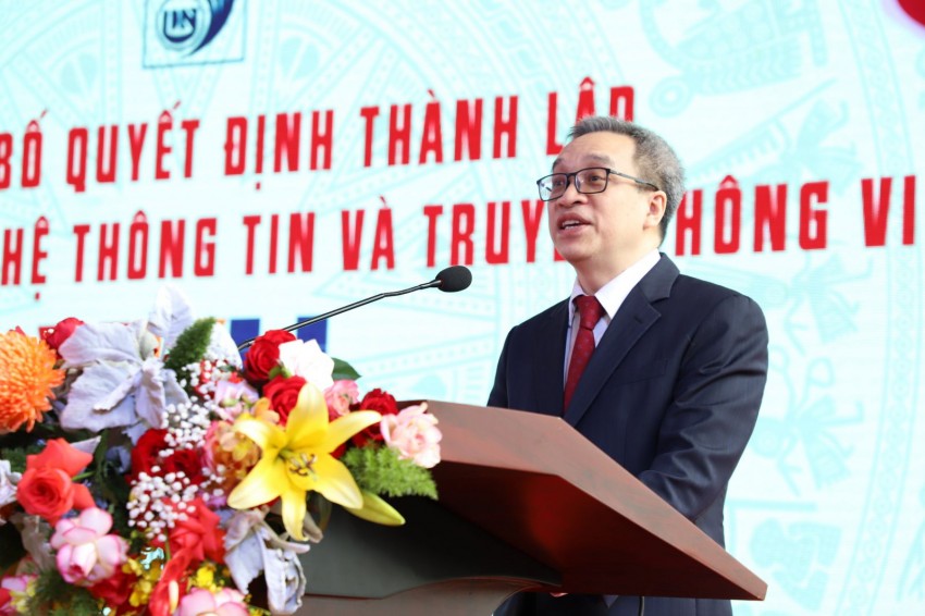 Phát biểu giao trọng trách mới cho Nhà trường, PGS.TS. Nguyễn Ngọc Vũ-Bí thư Đảng ủy, Giám đốc ĐHĐN đã gửi những lời chúc mừng tốt đẹp nhất đến các thế hệ lãnh đạo, quản lý, cán bộ, giảng viên, cựu sinh viên và sinh viên của VKU cũng như các đơn vị hợp thành, đặc biệt Giám đốc ĐHĐN trân trọng cám ơn sự quan tâm, chỉ đạo, ủng hộ của hai Chính phủ Việt Nam, Hàn Quốc, Bộ GD&ĐT, Bộ TT&TT và các bộ, ngành, thành phố Đà Nẵng và các địa phương để ĐHĐN có thêm trường ĐH thành viên thứ sáu đóng góp tích cực thực hiện sứ mệnh “phát triển vùng và đất nước”, trong đó có nhiệm vụ quan trọng là cung cấp nguồn nhân lực chất lượng cao các ngành CNTT và Truyền thông, là bước đột phá để ĐHĐN tiếp tục phát triển xứng tầm một trong ba trung tâm đào tạo, nghiên cứu khoa học và hợp tác quốc tế của cả nước, có uy tín thứ hạng trong hệ thống giáo dục ĐH khu vực và quốc tế.