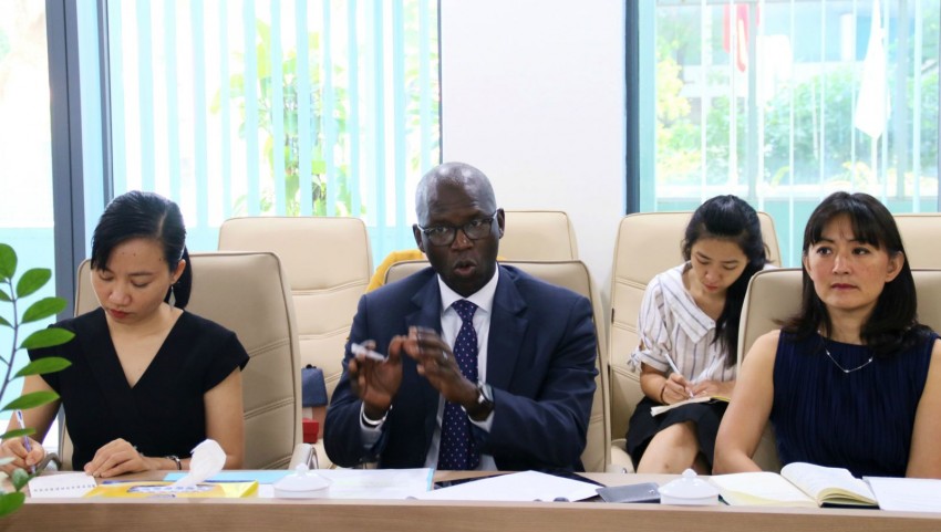 Sáng ngày 04/10/2019, PGS.TS Ngô Văn Dưỡng-Phó Giám đốc Đại học Đà Nẵng (ĐHĐN)cùng PGS.TS Lê Quang Sơn-Phó Giám đốc ĐHĐN đã tiếp và làm việc với đoàn Ngân hàng Thế giới (WB) tại Việt Nam gồm có Giám đốc Quốc gia Ousmane Dione và bà Keiko Inoue-Điều phối Chương trình Phát triển Con người-Giới-Việc làm đến thăm và làm việc tại ĐHĐN. Cùng tham dự có Chánh Văn phòng ĐHĐN Cao Xuân Tuấn và đại diện lãnh đạo các ban chức năng (Hợp tác Quốc tế, Kế hoạch Tài chính, Cơ sở Vật chất, Chuẩn bị Dự án).