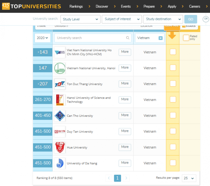 Tám trường ĐH Việt Nam được xếp hạng trong top 451-500 trường ĐH tốt nhất Châu Á bao gồm: ĐH Quốc gia thành phố Hồ Chí Minh (143); ĐH Quốc gia Hà Nội (147); Trường ĐH Tôn Đức Thắng (207); Trường ĐH Bách khoa Hà Nội (261-270); Trường ĐH Cần Thơ (401-450); Trường ĐH Duy Tân, ĐH Huế, ĐH Đà Nẵng (451-500).