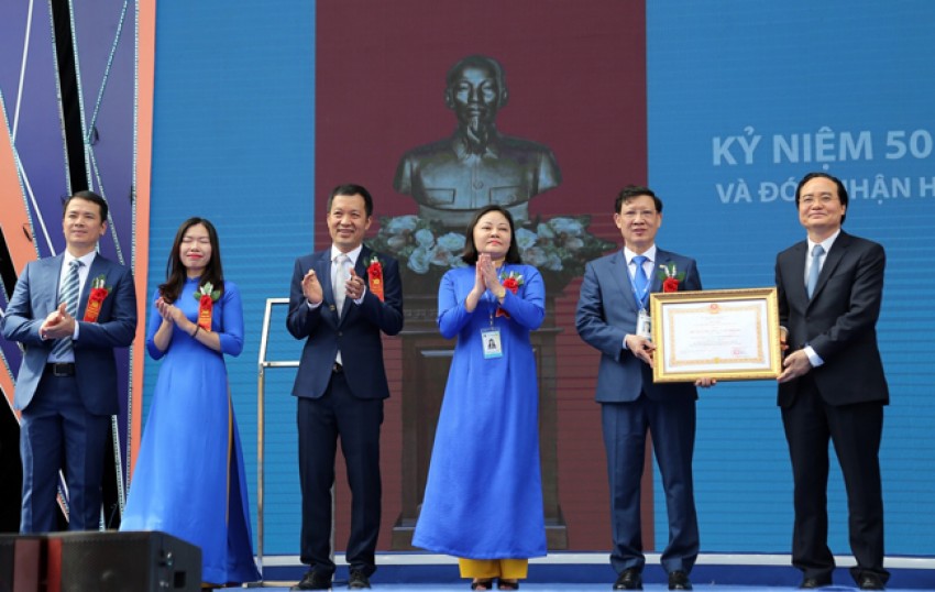 | Bộ trưởng Bộ GD&ĐT Phùng Xuân Nhạ, thừa ủy quyền của Chủ tịch nước, gắn Huân chương Lao động hạng Nhất, phần thưởng cao quý trao tặng Trường ĐHSP Nghệ thuật Trung ương. |