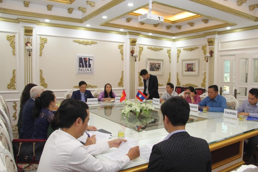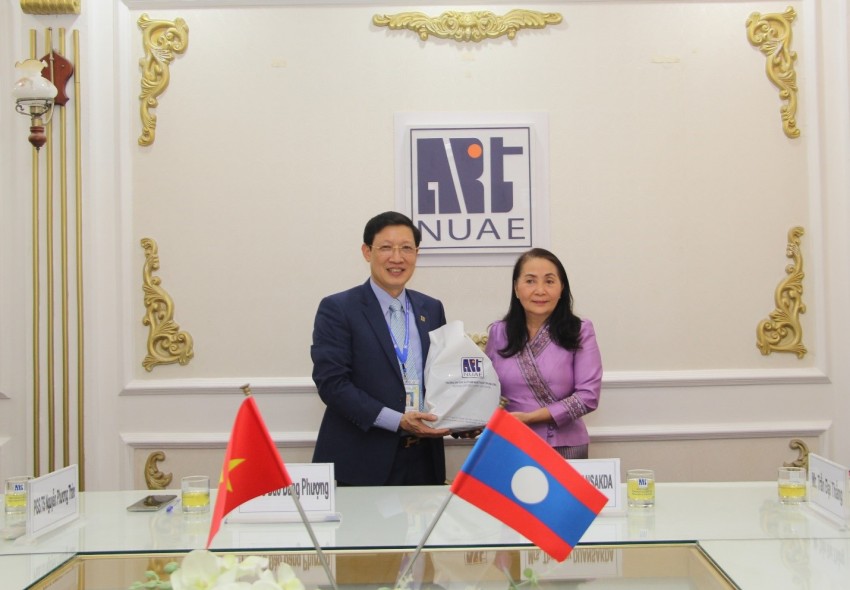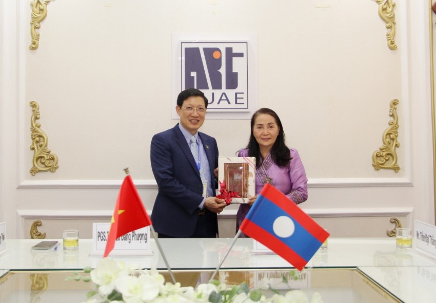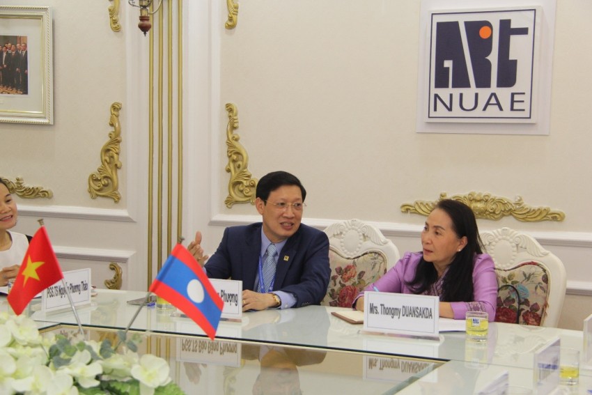 PGS.TS. Đào Đăng Phượng - Bí thư Đảng ủy, Hiệu trưởng và bà Thongmy DUANSAKDA - Phó Cục trưởng Cục Công tác sinh viên, Bộ Giáo dục và Thể thao Lào tại buổi làm việc