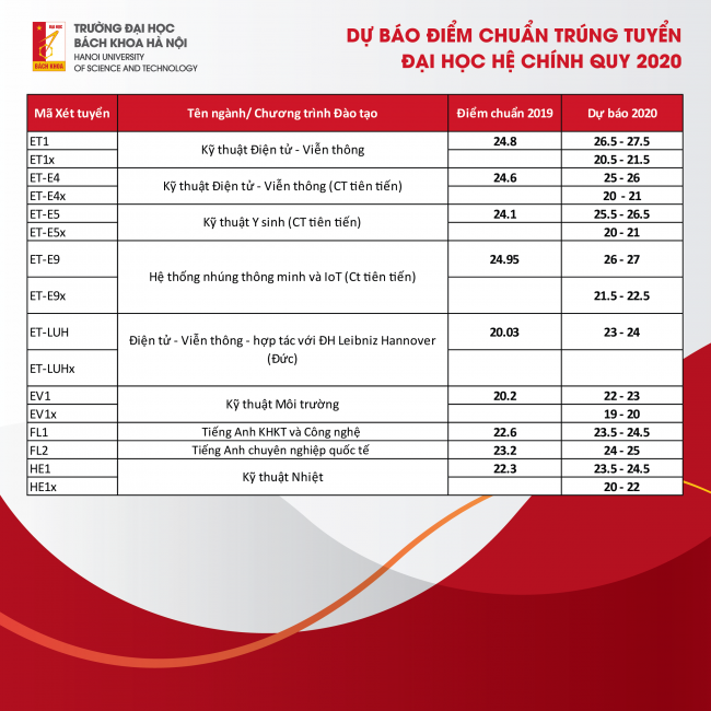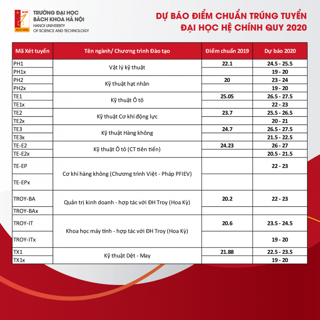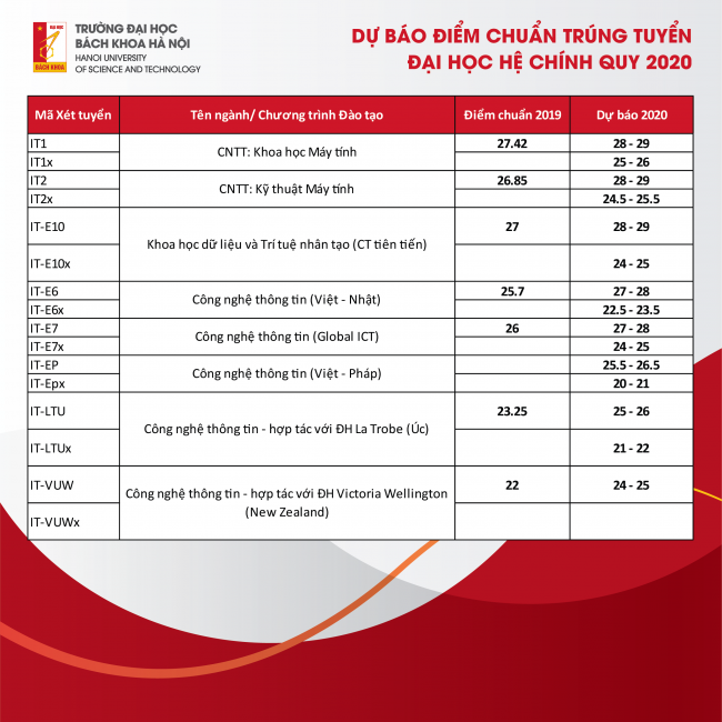 Ghi chú: các mã xét tuyển có chữ x ở cuối (VD: BF1x, CH1x, IT1x...) sử dụng tổ hợp A19 và A20 (kết hợp bài kiểm tra tư duy và Toán + Lý/ hoặc Hoá)