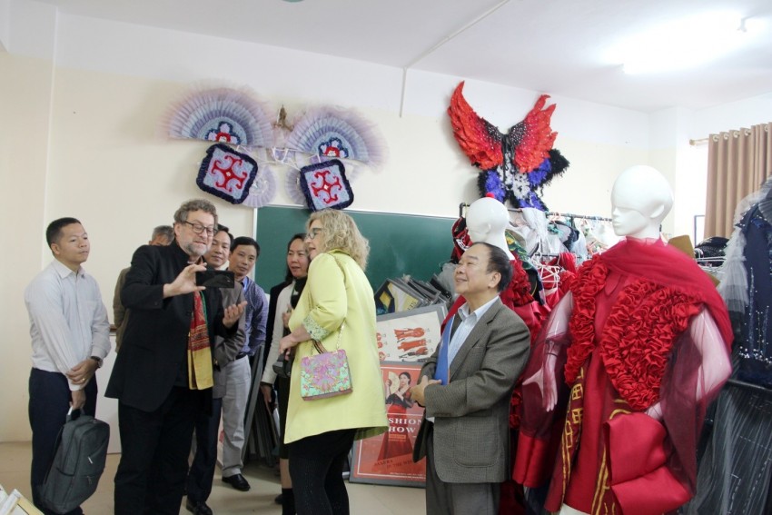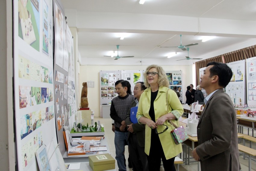 Sau buổi tiếp, đoàn công tác Tập đoàn Lehmbaugruppe - Leipzig tham quan thực tế phòng trưng bày của khoa Thiết kế Thời trang và phòng trưng bày sản phẩm thiết kế của sinh viên khoa Thiết kế Đồ họa.