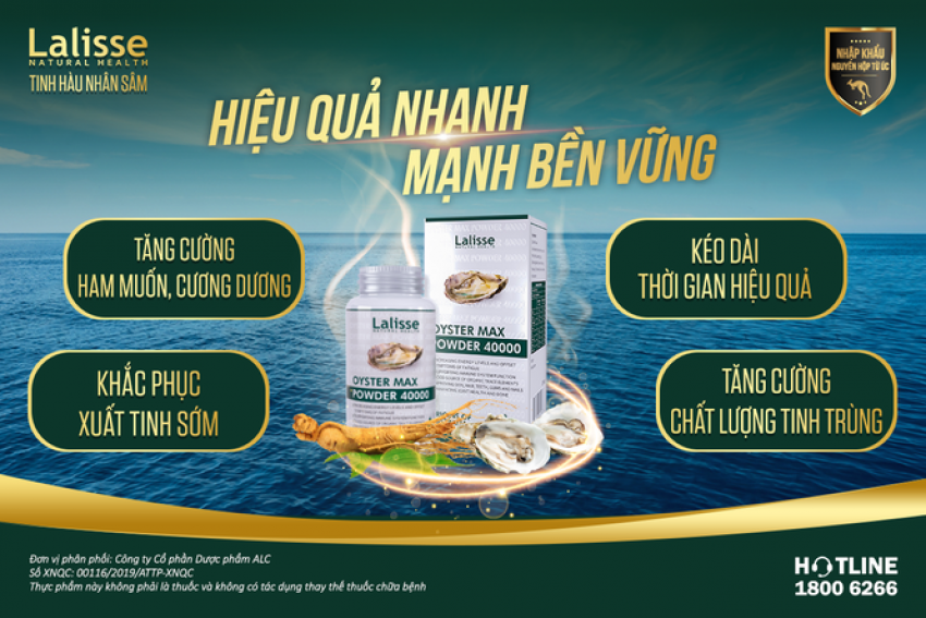 | Với sự kết hợp giữa chiết xuất tinh chất hàu biển Tasmania (Úc) - vùng biển đạt chất lượng về nuôi trồng hàu biển sạch và nhân sâm Hàn Quốc, cùng với kẽm, canxi, Tinh hàu nhân sâm Lalisse đang là sản phẩm hỗ trợ tăng cường sinh lý nam giới, cải thiện chức năng cương dương, tăng cường sinh lực và tăng chất lượng - số lượng tinh trùng ở nam giới được tin dùng trên thị trường. Trong đó, mỗi 2 viên nang Tinh hàu nhân sâm Lalisse chứa 40.000mg hàu tươi (tương đương 320mg chiết xuất hàu biển).