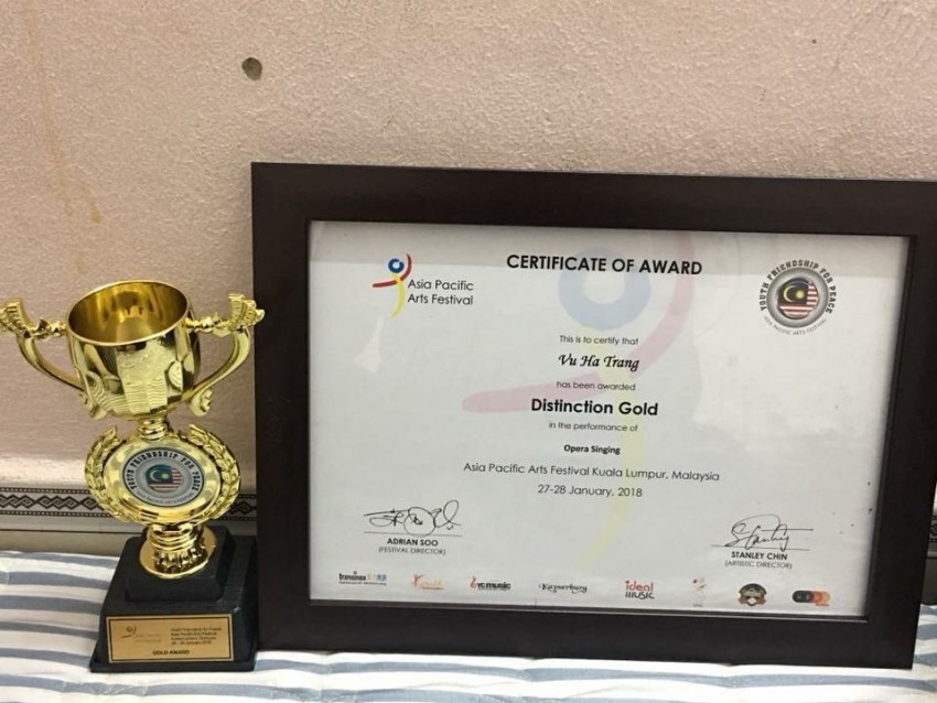 Phần thưởng và chứng nhận đạt giải vàng thi hát Opera