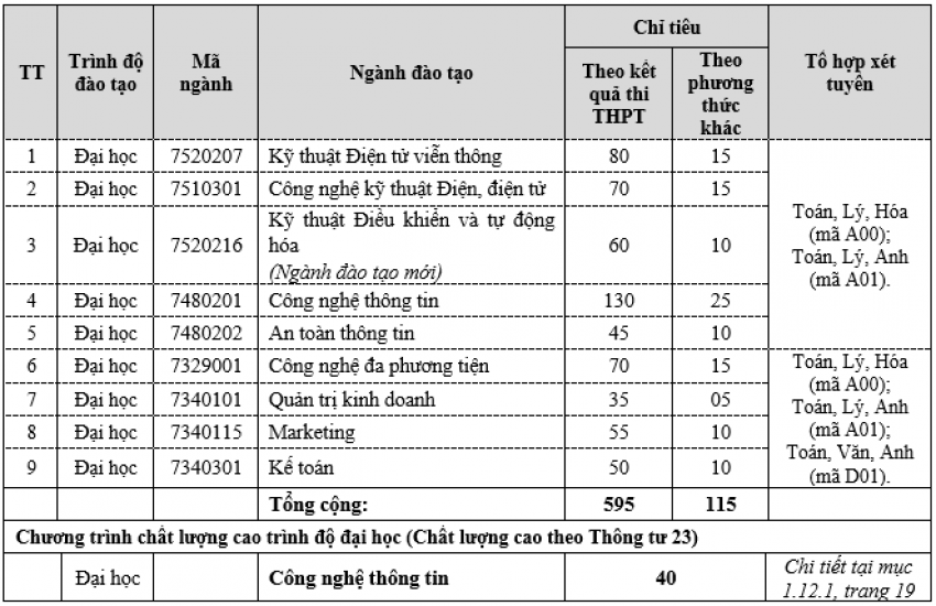 d) Các thí sinh trúng tuyển theo phương thức xét tuyển kết hợp (với đối tượng đã có Chứng chỉ SAT/ACT hoặc Chứng chỉ tiếng Anh) vào các ngành Kỹ thuật Điện tử viễn thông, Kỹ thuật Điện điện tử, Công nghệ thông tin, An toàn thông tin và Kỹ thuật Điều khiển và tự động hóa được ưu tiên xét tuyển thẳng vào chương trình chất lượng cao ngành Công nghệ thông tin (nếu có nguyện vọng); với các đối tượng còn lại trong phương thức xét tuyển kết hợp, sau khi trúng tuyển sẽ được đăng ký xét tuyển vào chương trình chất lượng cao ngành Công nghệ thông tin giống như đối tượng đã trúng tuyển theo phương thức xét tuyển dựa trên kết quả thi THPT như mục a nêu trên.