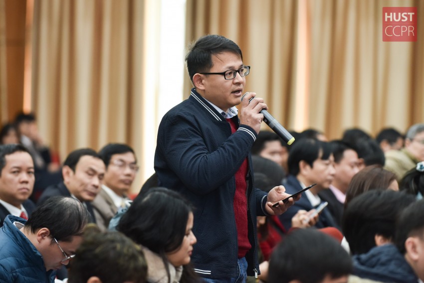 G. Vũ Văn Yêm, Trưởng phòng Tổ chức Cán bộ, phát biểu ý kiến về việc nâng cao chất lượng chuyên môn và đời sống của đội ngũ cán bộ tại Hội nghị Cán bộ Viên chức năm 2020 diễn ra ngày 19/1 tại hội trường C2 Trường Đại học Bách khoa Hà Nội. Ảnh: Duy Thành.