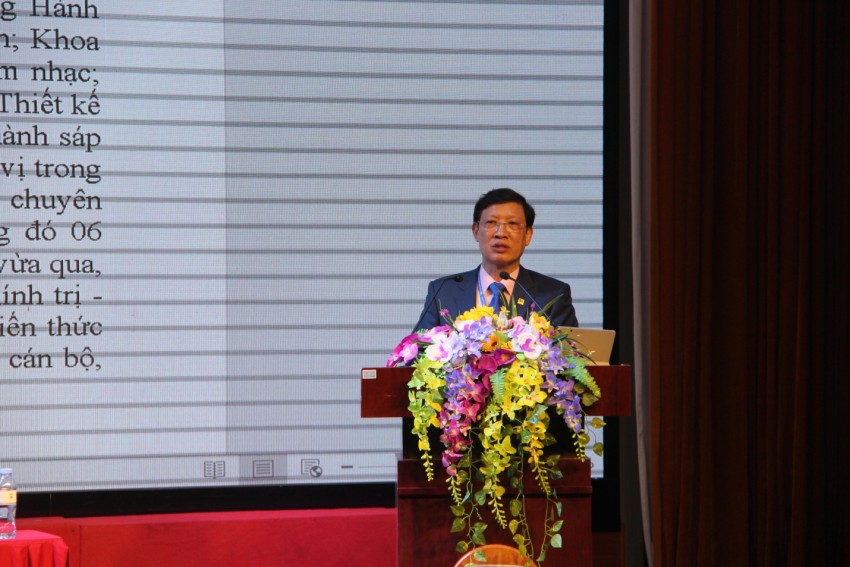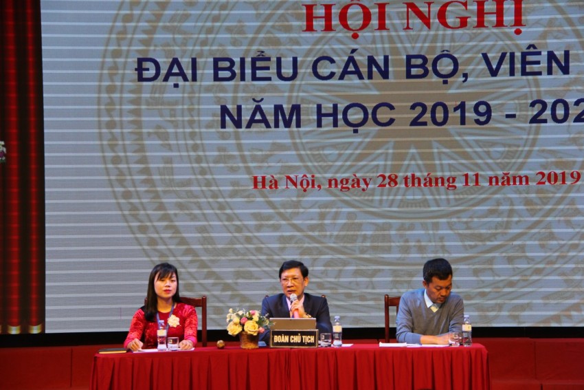 Thay mặt đoàn Chủ tịch, PGS.TS. Đào Đăng Phượng - Bí thư Đảng ủy, Hiệu trưởng đã tổng kết, đánh giá kết quả việc thực hiện Nghị quyết Hội nghị cán bộ, viên chức trong năm học 2018 - 2019. PGS.TS. Đào Đăng Phượng đã nêu khái quát những thành tích nổi bật cũng như chỉ ra những điểm còn tồn tại trên các mặt công tác tiêu biểu của Nhà trường như: công tác Chính trị tư tưởng; Tổ chức cán bộ; Đào tạo; Quản lý học viên, sinh viên; Nghiên cứu khoa học và Hợp tác quốc tế; Đảm bảo chất lượng; công tác của các Trung tâm; công tác đoàn thể... Bên cạnh đó, PGS.TS. Đào Đăng Phượng đặc biệt nhấn mạnh đến việc chỉ ra nguyên nhân của những vấn đề còn tồn tại và nghiêm túc nhìn nhận trách nhiệm của lãnh đạo nhà trường và lãnh đạo các đơn vị.