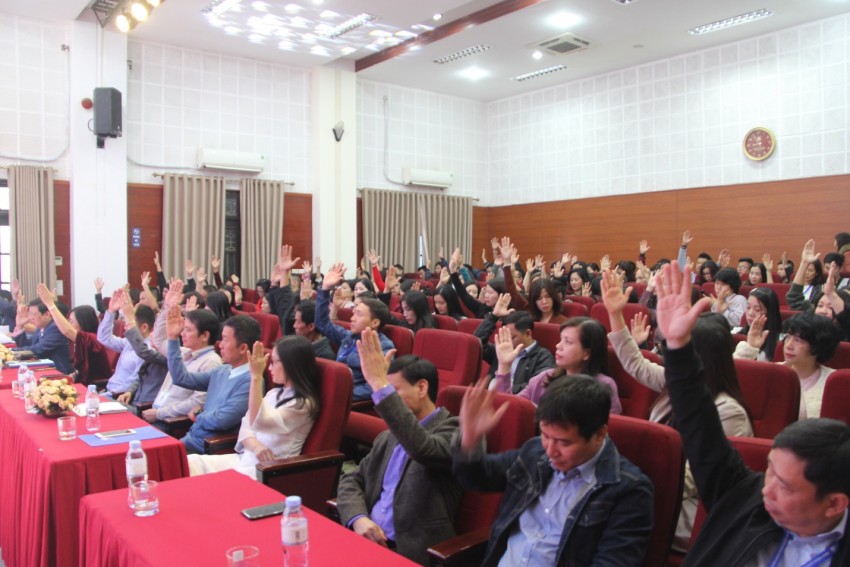 Các đại biểu tham dự biểu quyết thông qua Nghị quyết Hội nghị, phương hướng, nhiệm vụ và phong trào thi đua trong năm học 2019 - 2020
