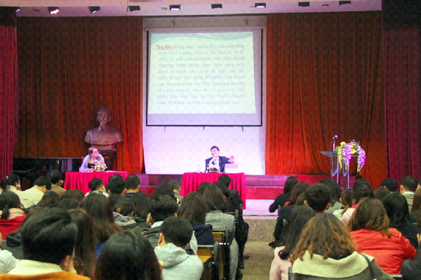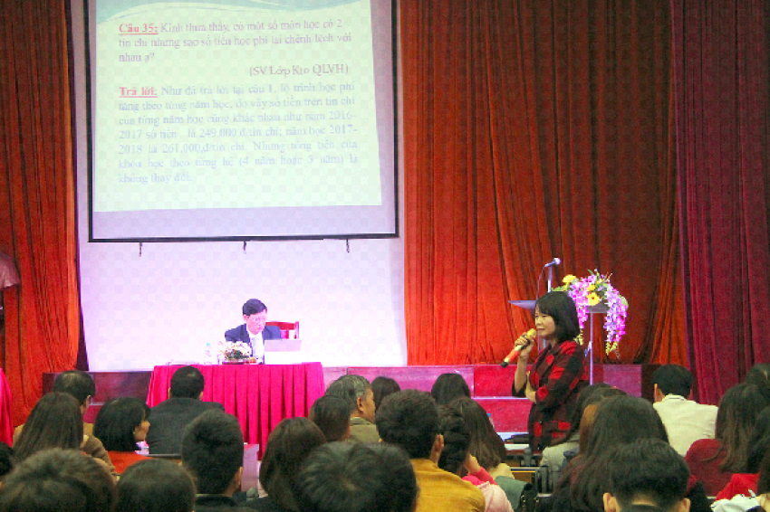 Với sự chủ trì của thầy Hiệu trưởng, đại diện sinh viên tham gia Hội nghị đã trực tiếp đưa ra nhiều câu hỏi xung quanh mọi vấn đề liên quan đến quá trình học tập, sinh hoạt tại trường từ chương trình học tập, đăng ký các môn học theo học chế tín chỉ, cơ sở vật chất tại phòng học, trang thiết bị dạy học, chứng chỉ đầu ra đối với các môn ngoại ngữ, tin học...đến chế độ học bổng, điều kiện sinh hoạt tại ký túc xá. Những băn khoăn của các em sinh viên đã được Ban giám hiệu và lãnh đạo các đơn vị tiếp nhận và trả lời thỏa đáng dựa trên chức năng nhiệm vụ của từng đơn vị; các quy chế, quy định của Bộ Giáo dục và Đào tạo cũng như căn cứ vào điều kiện thực tế của Nhà trường. Hội nghị đã tiếp nhận và giải đáp các thắc mắc, đề xuất về những vấn đề được đông đảo sinh viên Nhà trường quan tâm. Với tinh thần chú trọng, quan tâm tới người học, lãnh đạo Nhà trường cũng khẳng định luôn nỗ lực hết sức để cải thiện cơ sở vật chất và xây dựng môi trường học tập thuận lợi nhất cho các sinh viên, học viên theo học tại trường.