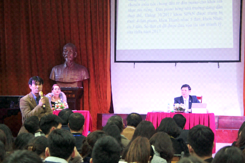 Ngày 04/01/2018, Trường ĐHSP Nghệ thuật TW đã tổ chức Hội nghị đối thoại giữa Hiệu trưởng với sinh viên năm học 2016-2017. Hội nghị là dịp để sinh viên nhà trường được đối thoại, trình bày tâm tư, nguyện vọng của mình với Hiệu trưởng, nhằm thiết lập kênh thông tin đa chiều giữa Nhà trường và sinh viên; từ đó, xây dựng một môi trường học tập dân chủ, thân thiện với người học.