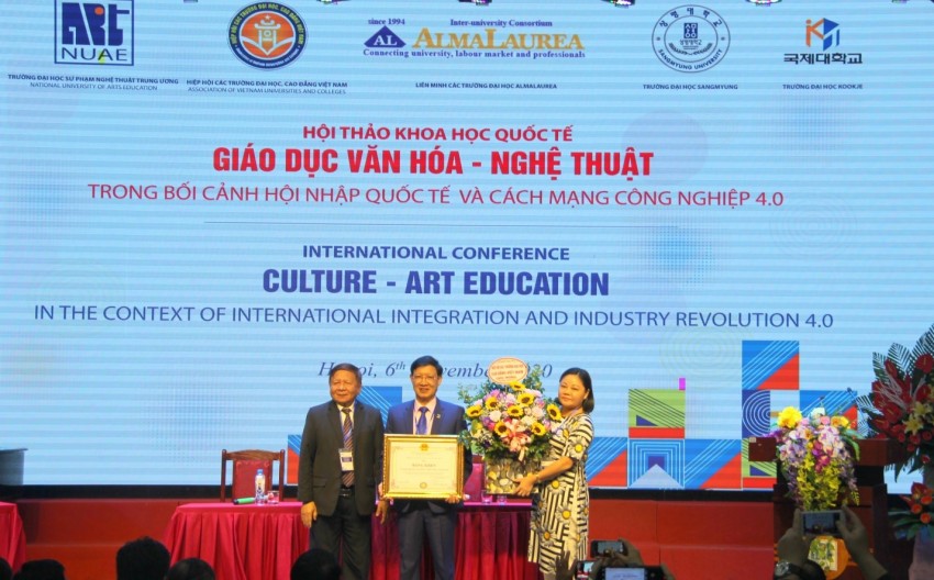 PGS.TS. Trần Xuân Nhĩ - Phó Chủ tịch Hiệp hội Các trường đại học, cao đẳng Việt Nam trao Bằng khen cho Trường ĐHSP Nghệ thuật TW đã có thành tích xuất sắc trong đào tạo nguồn nhân lực chất lượng cao cho đất nước và tích cực tham gia các hoạt động của Hiệp hội