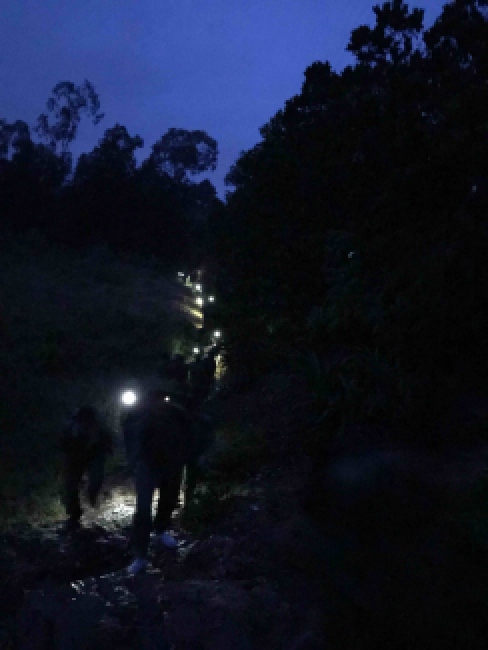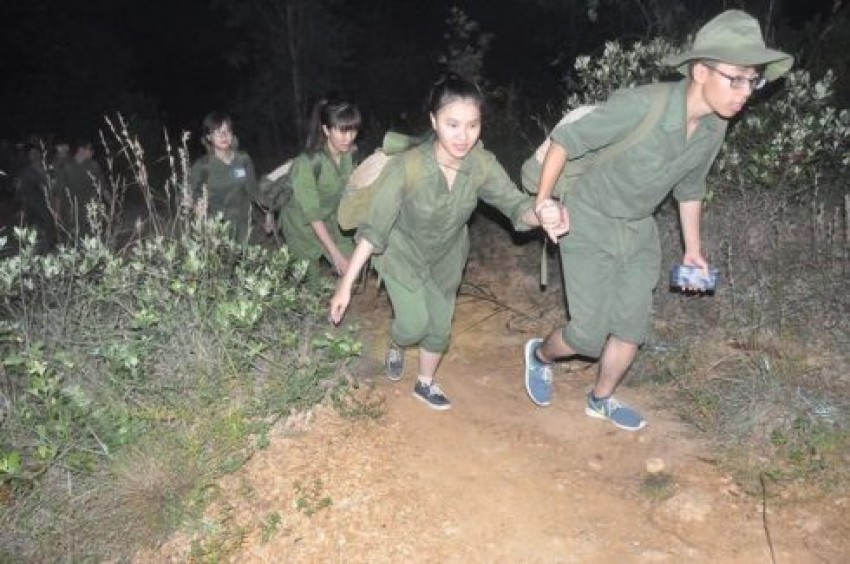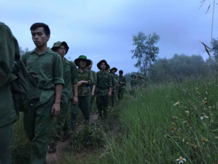 Từ Trung tâm Giáo dục Quốc phòng HN2 ra đến chợ, đoạn đường này bằng phẳng, các bạn đi hàng 2, mỗi người nên đi cách nhau 1 sải tay để đảm bảo kết nối và an toàn. Bước vào đoạn đường đồi núi đầy hiểm trở, vừa hẹp lại ngoằn nghèo, nhiều cỏ dại, đấy là chưa kể có nhiều dốc cao, đường đá gồ ghề, trơn trượt do trời tối lại mưa, các “chiến sĩ” nhanh chóng chuyển thành hàng 1 để di chuyển cho phù hợp với địa hình.