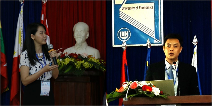 PGS.TS. Võ Thị Thúy Anh- Phó Hiệu trưởng Trường ĐH Kinh tế (bên trái) và PGS.TS.Nguyễn Văn Long- Phó Hiệu trưởng Trường ĐH Ngoại ngữ (bên phải) giới thiệu tổng quan về mỗi trường