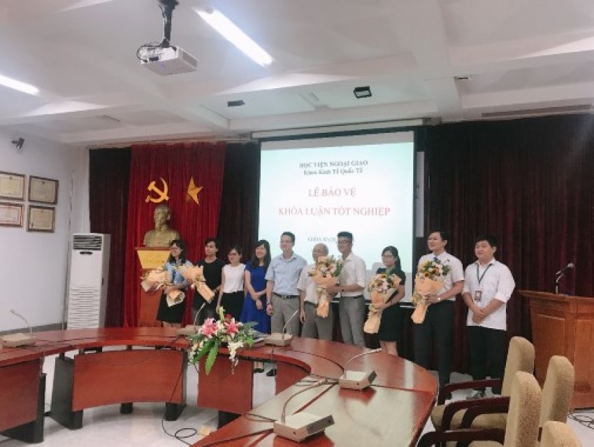 Sáng ngày 20/05/2019, tại Phòng Truyền thống, Học viện Ngoại giao, năm sinh viên khoa Kinh tế Quốc tế đã đạt được thành tích cao trong buổi bảo vệ Khoá luận tốt nghiệp do PGS.TS Đặng Hoàng Linh – Trưởng Khoa chủ trì. Buổi bảo vệ có sự góp mặt của PGS.TS Nguyễn Văn Lịch, TS. Nguyễn Thị Xuân Thu, ThS. Nguyễn Thị Thu Hoàn – Chủ nhiệm KT42, ThS. Nguyễn Minh Trang, cùng bạn bè và người thân của năm sinh viên tham gia bảo vệ.