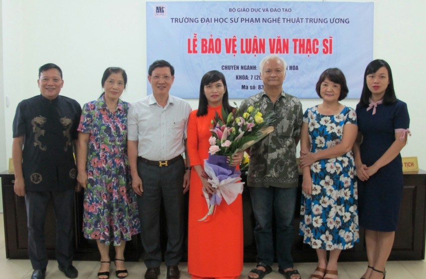 Học viên Ngô Thị Thu chụp ảnh lưu niệm cùng Hội đồng khoa học