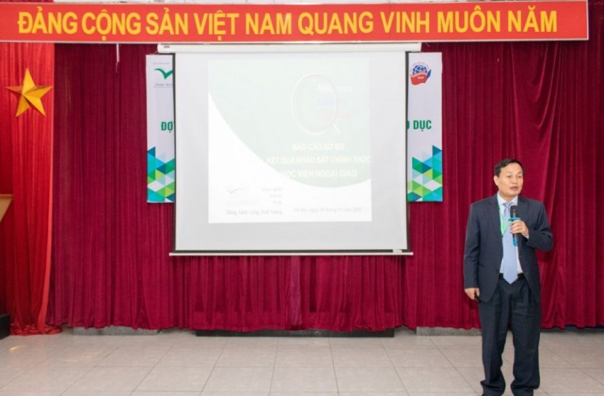 Tiếp nối chương trình, GS. TS. Nguyễn Hữu Đức – Trưởng Đoàn Đánh giá ngoài (ĐGN) đã trình bày “Báo cáo sơ bộ kết quả đợt Khảo sát chính thức Học viện Ngoại giao”. Nội dung báo cáo bao gồm tổng quan quá trình đánh giá, kết quả đánh giá và kết luận sơ bộ của Đoàn Khảo sát. Kết quả sơ bộ cho thấy Học viện Ngoại giao đã đáp ứng cơ bản các tiêu chí đánh giá theo bộ tiêu chí của Bộ giáo dục về chất lượng đào tạo. Đoàn sẽ gửi báo cáo kết quả chính thức cho Học viện trong thời gian tới đây