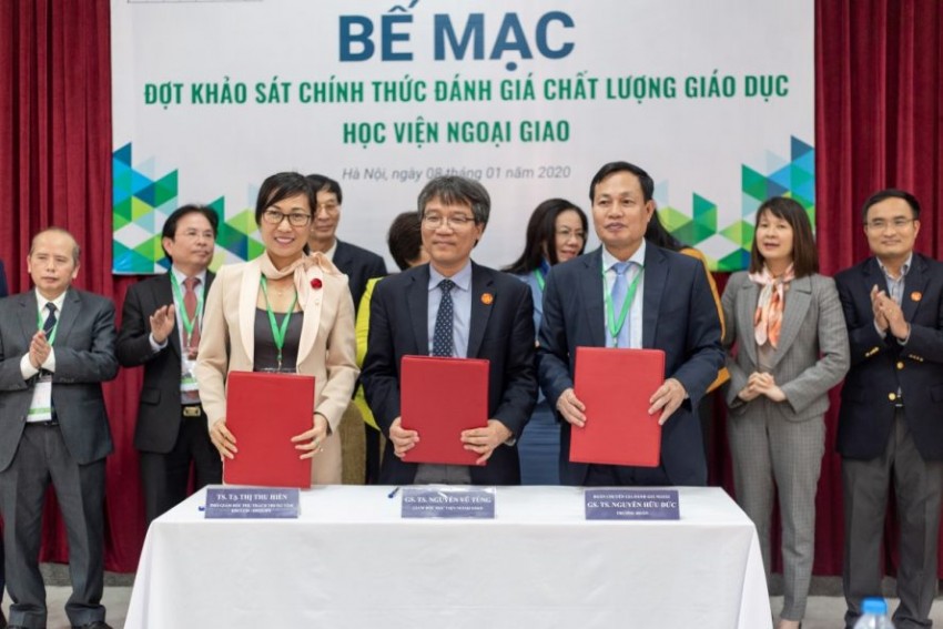 Kết thúc chương trình, GS. TS. Nguyễn Hữu Đức, Trưởng đoàn Đánh giá ngoài, TS. Tạ Thị Thu Hiền, Phó Giám đốc Phụ trách Trung tâm Kiểm định chất lượng giáo dục – Đại học Quốc gia Hà Nội và GS. TS. Nguyễn Vũ Tùng, Giám đốc Học viện Ngoại giao đã tiến hành ký Biên bản ghi nhớ hoàn thành đợt Khảo sát chính thức.