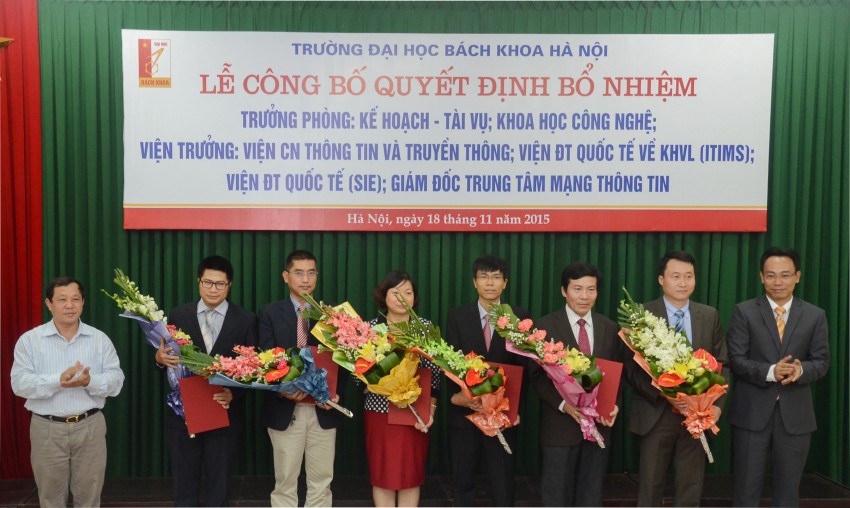 Mở đầu buổi Lễ, TS Trần Ngọc Khiêm – Trưởng Phòng Tổ chức Cán bộ công bố Quyết định bổ nhiệm chức danh Trưởng các đơn vị: Phòng Kế hoạch Tài vụ, Phòng Khoa học Công nghệ, Trung tâm Mạng thông tin, Viện Công nghệ Thông tin và Truyền thông, Viện Đào tạo quốc tế về Khoa học Vật liệu (ITIMS) và Viện Đào tạo quốc tế (SIE).