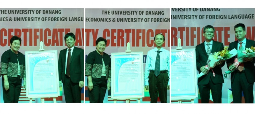 Trước sự chứng kiến của đông đảo đại biểu, đại diện lãnh đạo các khoa, trường thành viên của ĐHĐN có CTĐT được đánh giá đón nhận Chứng nhận đạt chuẩn chất lượng AUN-QA từ TS.Wyona C.Patalinghug-Phó Chủ tịch Hội đồng ĐBCL AUN-QA. Thay mặt lãnh đạo hai trường, PGS.TS.Trần Hữu Phúc-Hiệu trưởng Trường ĐH Ngoại ngữ-ĐHĐN đã phát biểu trân trọng cám ơn đối với các thành viên của Hội đồng ĐBCL AUN-QA, các cấp lãnh đạo ĐHĐN và các bên liên quan đã dành cho Nhà trường sự hỗ trợ, đồng hành trong quá trình đánh giá ngoài các CTĐT cũng như công tác ĐBCL, kiểm định giáo dục của Nhà trường trong thời gian qua. Với tầm nhìn hướng tới là một trong những trường ĐH hàng đầu khu vực Đông Nam Á với nhiều ngành mũi nhọn trong các lĩnh vực kỹ thuật, công nghệ, cả hai Trường ĐH Kinh tế và Trường ĐH Ngoại ngữ-ĐHĐN luôn đặt chất lượng lên hàng đầu trong mọi hoạt động, coi trọng công tác ĐBCL và kiểm định CTĐT. PGS.TS. Trần Hữu Phúc nhấn mạnh: “Chúng tôi sẽ tiếp tục nghiên cứu, thực hiện các khuyến nghị của các tổ chức kiểm định quốc tế và trong nước nhằm không ngừng nâng cao chất lượng đào tạo, đáp ứng nhu cầu xã hội và hội nhập quốc tế.