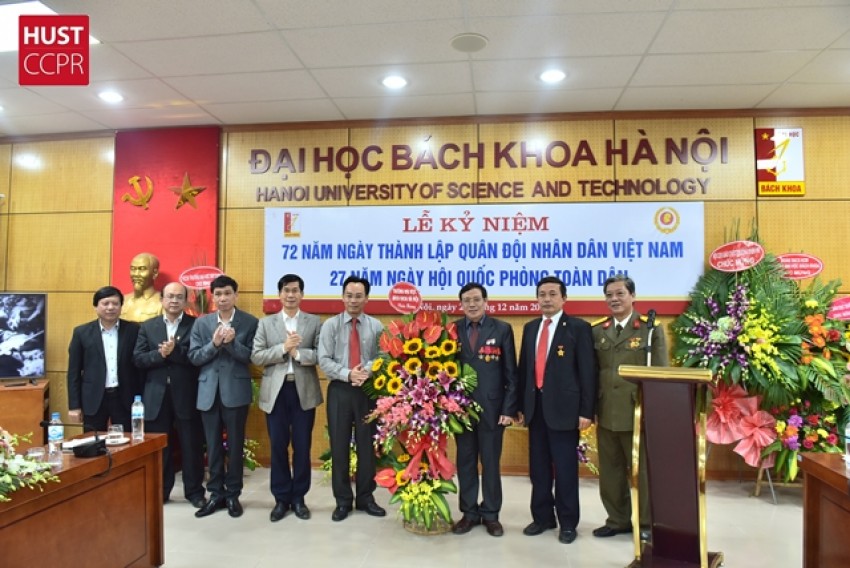 Phát biểu tại buổi Lễ, PGS Bùi Quốc Thái đã điểm lại chặng đường 72 năm lịch sử truyền thống hào hùng, vẻ vang của Quân đội nhân dân Việt Nam và nhấn mạnh: “Năm 2016, đánh dấu sự kiện trọng đại khi Trường ĐHBK Hà Nội tròn 60 tuổi. Lịch sử phát triển của Trường gắn liền với cuộc kháng chiến chống Mỹ và công cuộc xây dựng đất nước. Trường không chỉ là cái nôi đào tạo nhiều cán bộ khoa học kỹ thuật có trình độ cao mà còn là đơn vị khởi đầu cho nhiều hoạt động khác như phong trào “Ba sẵn sàng” trong sự nghiệp kháng chiến chống Mỹ, phong trào tình nguyện của sinh viên và công tác “Đền ơn đáp nghĩa”… Trong kháng chiến chống Mỹ cứu nước, gần 3.000 cán bộ và sinh viên Trường đã “Xếp bút nghiên lên đường bảo vệ Tổ quốc”. Lực lượng này đã bổ sung kịp thời cho quân đội trong các quân binh chủng, nhất là đối với các binh chủng kỹ thuật như: Không quân, Phòng không, Cơ giới, Công binh, Thông tin… Bên cạnh đó, đồng chí Chủ tịch Hội CCB Trường cũng cho biết: “Mới được thành lập được 11 năm, thời gian tuy không dài nhưng Hội CCB Trường đã thực sự trưởng thành, là Hội CCB vững mạnh trong khối 487. Các thành viên của Hội luôn phát huy truyền thống bộ đội Cụ Hồ, không chỉ là những người lính trung kiên trên mặt trận mà còn là người cán bộ gương mẫu trong thời bình, góp phần xây dựng Trường, xây dựng Hội ngày càng vững mạnh”.