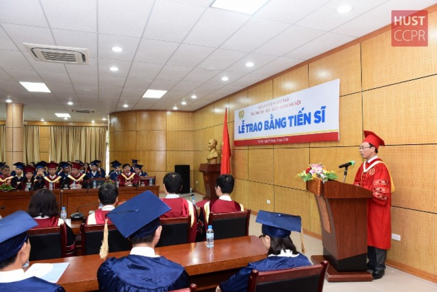 Chúc mừng và trao bằng cho các tân tiến sĩ, PGS Hoàng Minh Sơn phát biểu, bày tỏ niềm vui mừng và tự hào, bởi trong những năm gần đây Trường ĐHBK Hà Nội đã đạt được nhiều thành tích cao trong nghiên cứu khoa học và đào tạo sau đại học; góp phần cung cấp nguồn nhân lực chất lượng cao cho các cơ quan, doanh nghiệp... Hiệu trưởng mong rằng, sau khi được nhận học vị cao nhất về khoa học, các tân tiến sĩ sẽ tiếp tục có những đóng góp đối với sự nghiệp phát triển khoa học, giáo dục của nước nhà nói chung và trong từng lĩnh vực công tác nói riêng. Nhân dịp này, PGS Hoàng Minh Sơn đã gửi lời cảm ơn sâu sắc đến các thầy cô giáo hướng dẫn, sự nỗ lực của các tân tiến sĩ và gia đình.