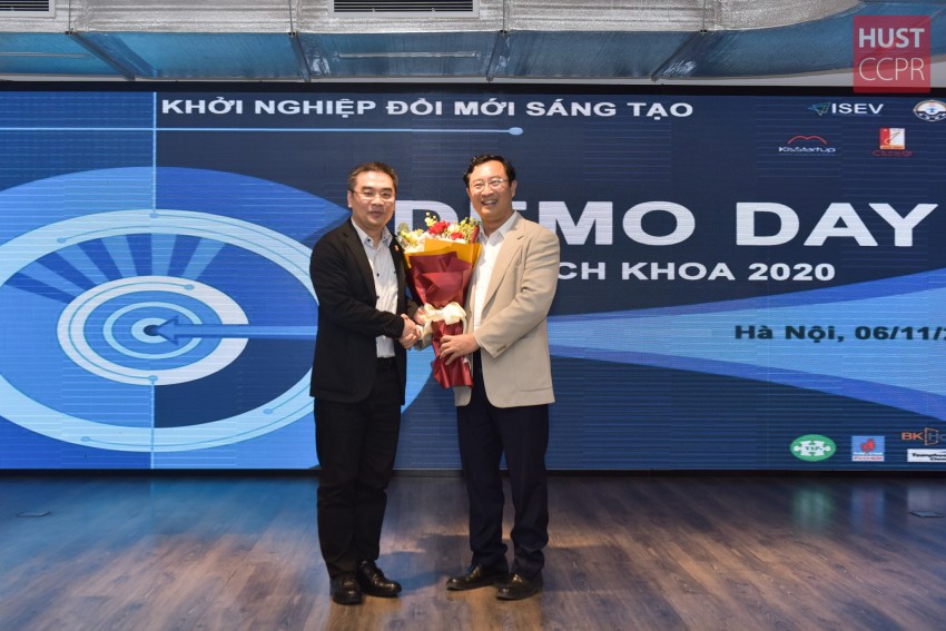 PGS. Huỳnh Đăng Chính, Phó Hiệu trưởng trường ĐHBK Hà Nội, cảm ơn ông Phạm Hồng Quất, Cục trưởng Cục Phát triển Thị trường và Doanh nghiệp khoa học và Công nghệ, Bộ Khoa học và Công nghệ tại Demo Day ngày 6/11/2020. Ảnh: CCPR-Duy Thành