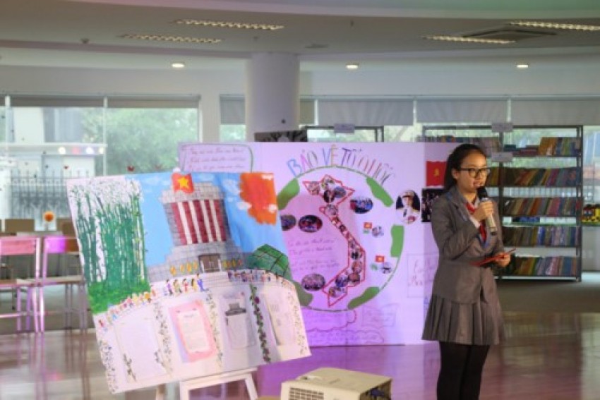 Học sinh Trường THPT Ban Mai (Hà Nội) thuyết minh về tranh vẽ Lăng Bác Hồ. Ảnh: ITN