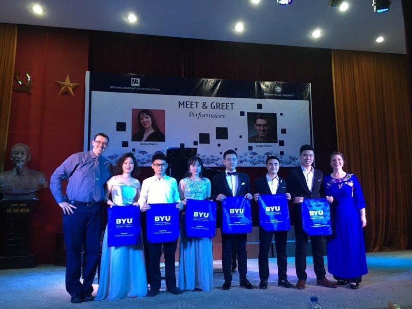 Minh Phương, thứ 2 từ bên trái sang cùng các sinh viên NUAE học tập, giao lưu biểu diễn cùng các giảng viên của Đại học Brigham Young (BYU), Mỹ