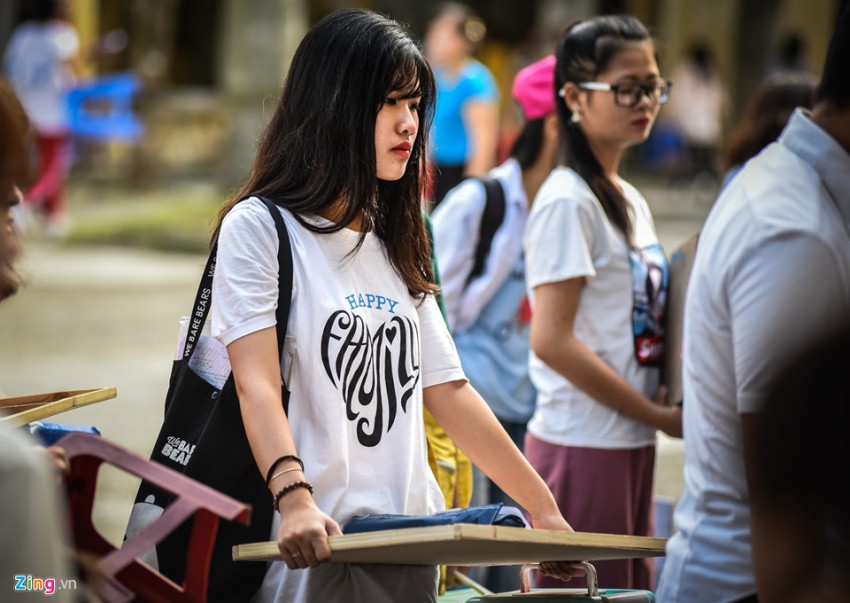 Sáng 11/7, hàng trăm thí sinh mang theo nhiều đồ đạc lỉnh kỉnh như bảng vẽ, bút màu, ghế đến trường dự thi vào Đại học Sư phạm Nghệ thuật Trung ương (Nguyễn Trãi, Hà Nội).