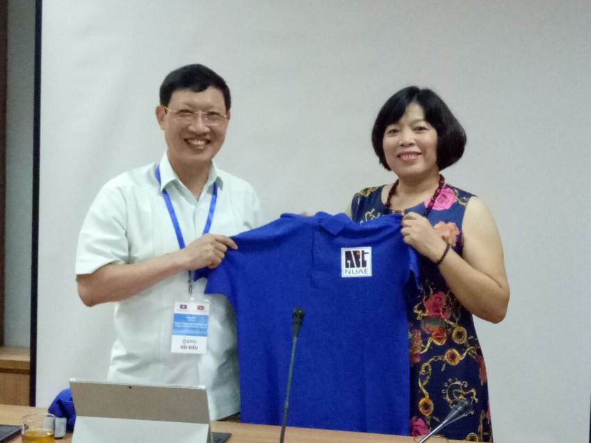 PGS. TS. Đào Đăng Phượng trao tặng đồng phục mang biểu tượng của NUAE cho các đồng chí Trưởng đơn vị làm nhiệm vụ tại Tỉnh Nam Định.
