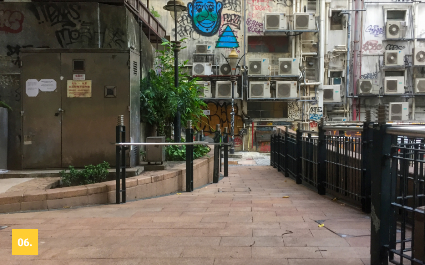 Đối với khu vực đi bộ, nhóm đã tăng cường tiện nghi cho người sử dụng bằng cách định vị cầu thang, cảnh quan và chỗ ngồi một cách chu đáo; tái thiết kế các bức tường trơ trụi để mở tầm nhìn cho người đi bộ khi kéo ra vỉa hè sẽ thấy trước mắt là hệ thống “tán cây” (được hình thành từ vải bạt nhiều màu sắc giúp tối ưu hóa việc sử dụng không gian vào mùa hè, đồng thời cho phép “dịch chuyển” các tán cây vào mùa đông...). Trên các bục nhỏ là những câu chuyện lịch sử của Hong Kong (được xen kẽ giữa các khoảng trống của băng ghế kiểu lượn sóng). “Chúng tôi tin rằng đây là cách không gian kể những câu chuyện, truyền đạt kiến thức cũng như kích thích sự tò mò và cảm hứng của người sử dụng không gian này.”, đại diện nhóm tác giả chia sẻ.