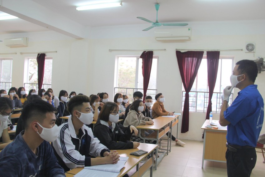Giảng viên của NUAE hướng dẫn sinh viên phòng, chống COVID-19 tại giảng đường.