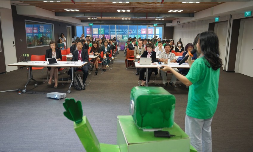 Robot Biya cũng có thể đến các trường học để truyền thông điệp, nâng cao ý thức cho các bạn nhỏ về bảo vệ môi trường, thiên nhiên thông qua việc bỏ rác đúng nơi quy định và phân loại rác thải.