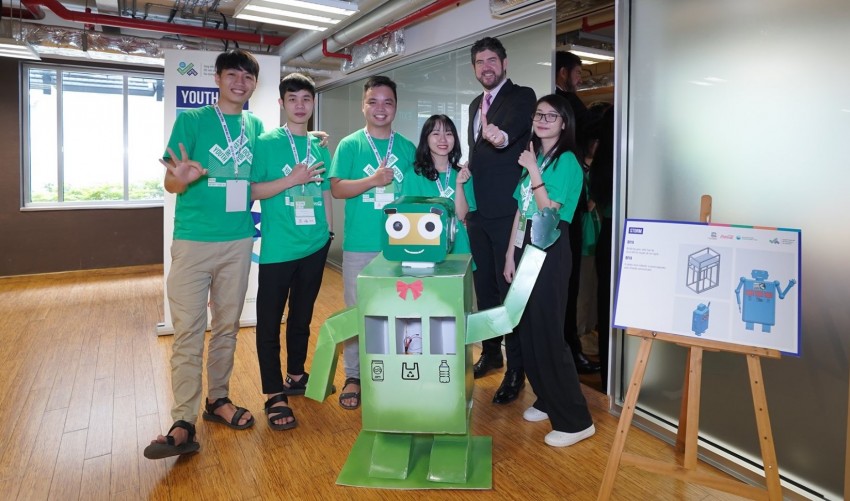 Tại đây, Robot Biya của nhóm sẽ chào đón du khách, trò chuyện, nhắc nhở quý khách bỏ rác và phân loại để giữ gìn, bảo vệ môi trường biển.