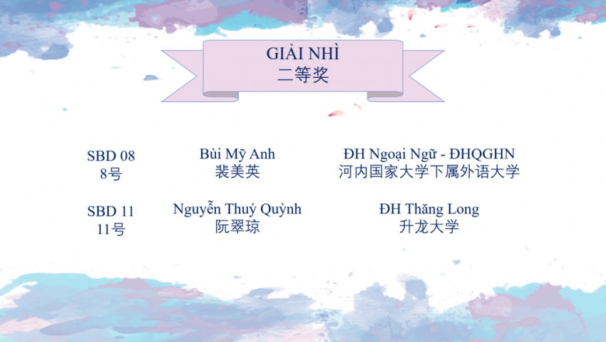 Kết thúc cuộc thi, Ban Giám khảo đã chọn ra được những thí sinh xuất sắc nhất để trao giải thưởng. Hai sinh viên Trường Đại học Ngoại ngữ tham gia đều giành được giải. Giải Nhất đã thuộc về em Trần Thị Hải Xuyên và em Bùi Mỹ Anh giành được giải Nhì.