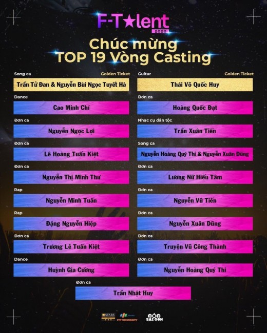 Sau hai ngày diễn ra thì vòng casting của F-Talent 2020 đã chính thức khép lại với những ấn tượng cực kì đậm nét với hai tấm vé vàng đã được trao. 18 tiết mục sẽ đi tiếp vào vòng trong và hãy cùng chờ đợi sự bùng nổ của các thí sinh tại vòng bán kết được diễn ra vào ngày 20.10.2020 tại hội trường lớn đại học FPT cơ sở Quận 9.