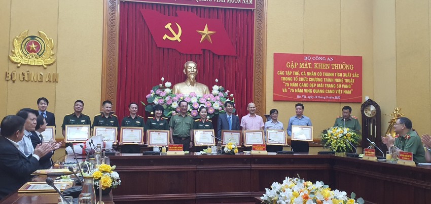 Tại buổi gặp mặt, Bộ Công an đã trao Bằng khen cho các tập thể và cá nhân đã có thành tích xuất sắc trong công tác phối hợp tổ chức các hoạt động kỷ niệm 75 năm CAND và 15 năm Ngày hội toàn dân bảo vệ ANTQ. PGS.TS Đào Đăng Phượng - Bí thư Đảng ủy, Hiệu trưởng - đại diện Ban Giám hiệu Nhà trường và TS. Lê Vinh Hưng - Trưởng khoa Sư phạm Âm nhạc đã được vinh danh trong buổi gặp mặt trọng thể.