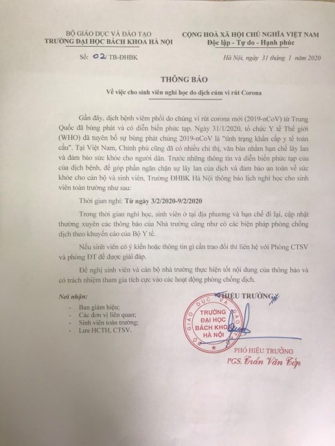 Đề nghị các sinh viên theo dõi sát bản tin của Phòng Công tác sinh viên và Phòng Đào tạo về kế hoạch học tập cũng như các biện pháp ngăn ngừa dịch bệnh và bảo vệ mình, người thân và cả cộng đồng trước một dịch bệnh khó lường.